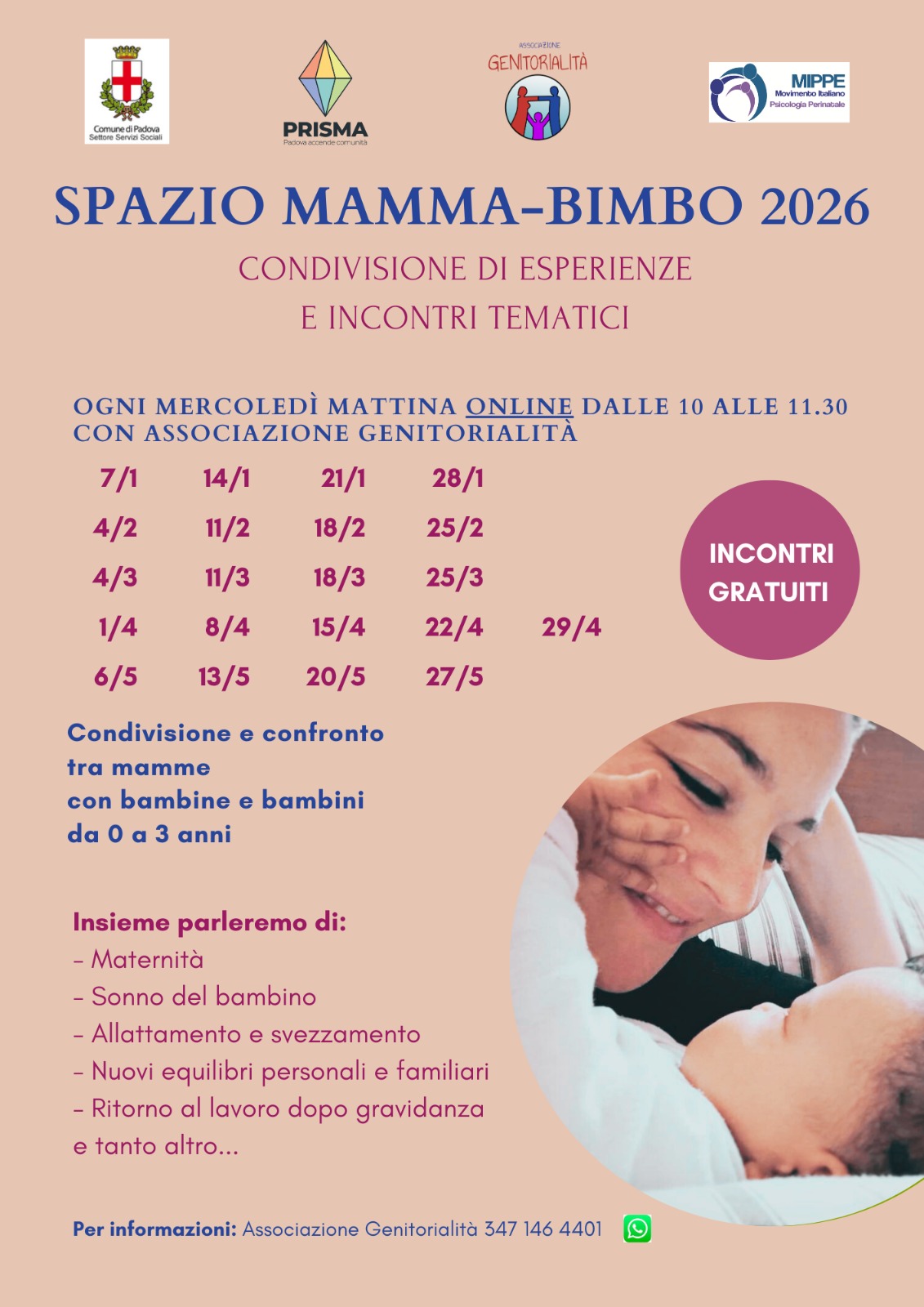 Un luogo di incontro, ascolto e confronto pensato per accompagnare le mamme nella nuova avventura della genitorialità, offrendo uno spazio sicuro in cui conoscersi, condividere esperienze e riflessioni e sentirsi sostenute nel percorso dell’essere genitori.